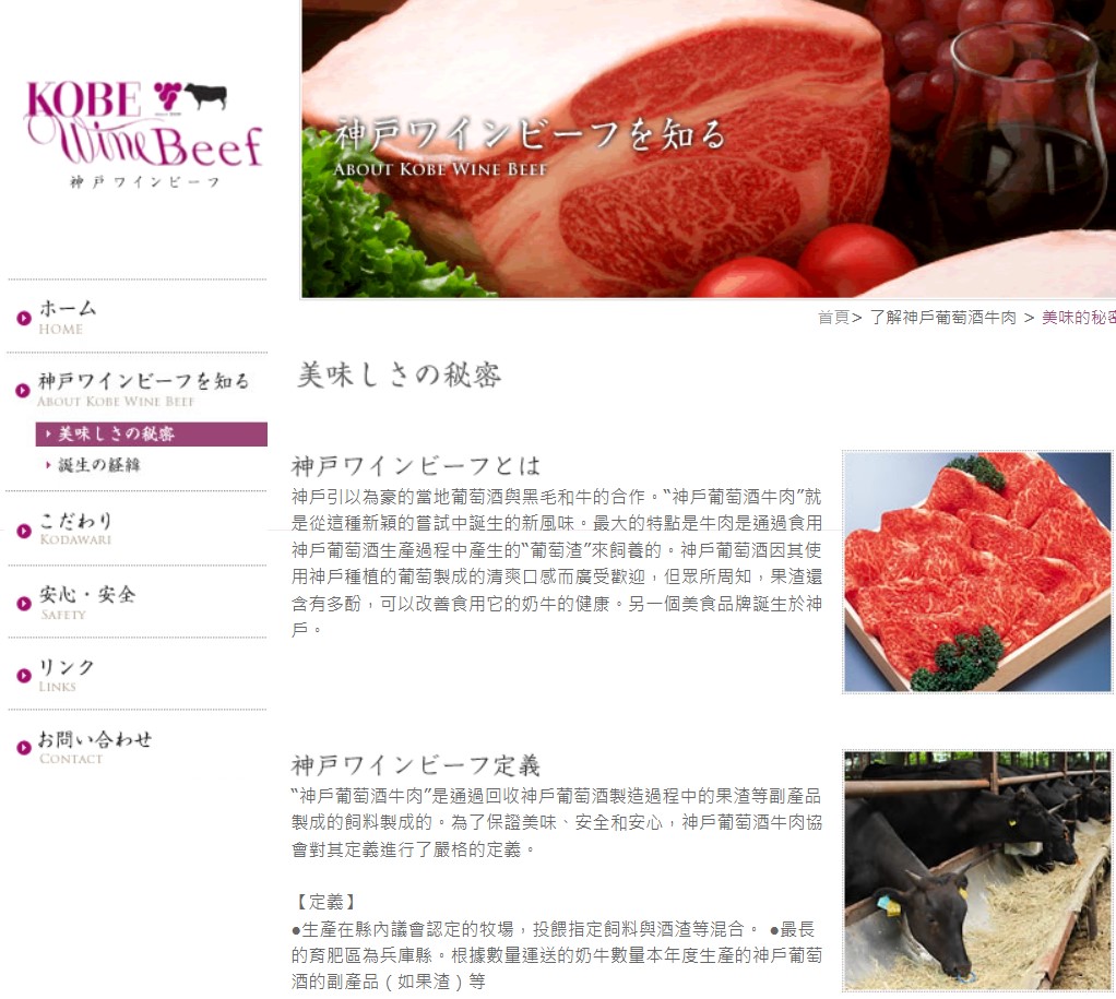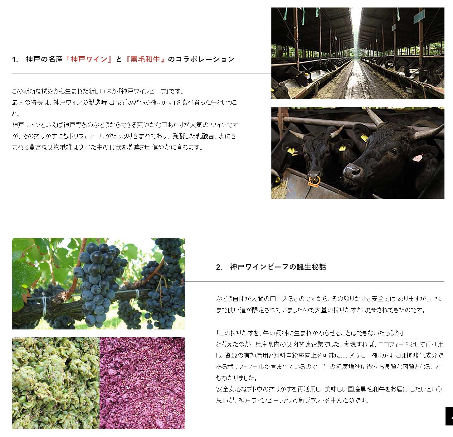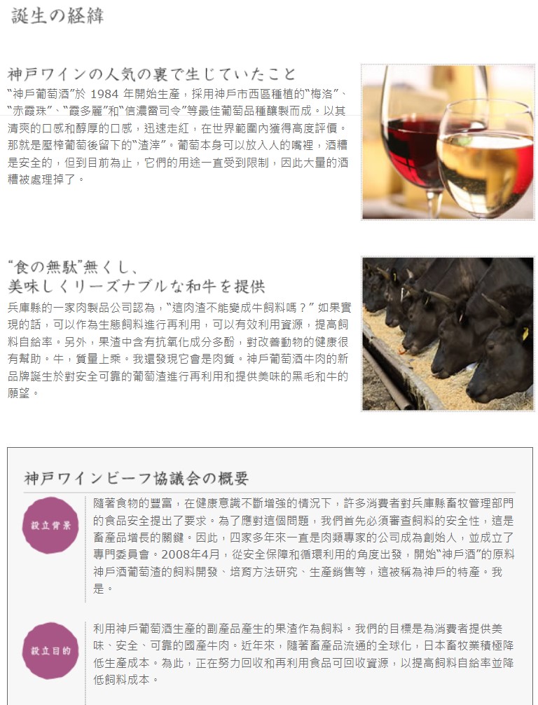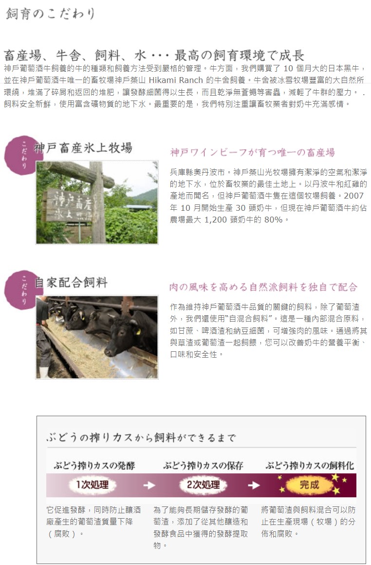 神戶紅酒牛是以神戶葡萄酒的酒粕發酵成的飼料餵養,不僅提升牛隻的免疫力,更增添牛肉本身的多酚和脂肪酸含量,